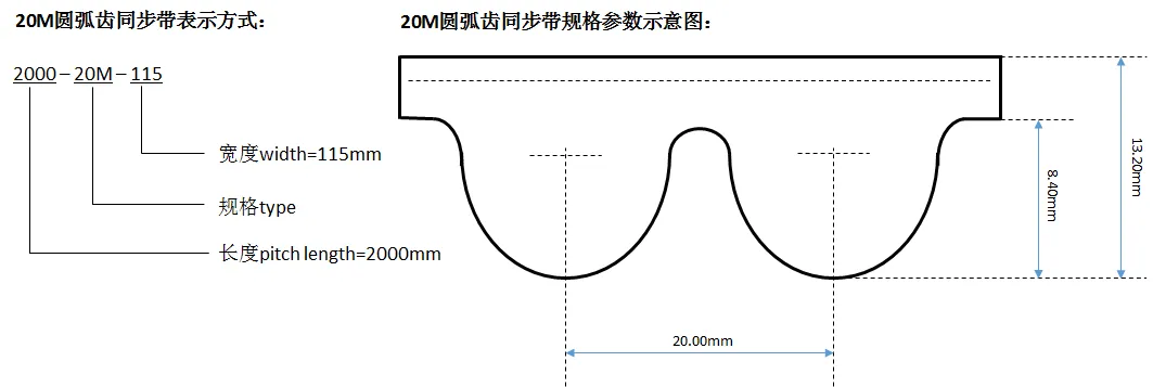 圓弧齒同步帶根據其規格參數(shù)不(bù)同存在多(duō)種分(fēn)類,HTD-20M同步帶即使其中之一(yī♠),其節距(齒距)為(wèi)20mm,齒厚為(wèi)8.4mm,帶厚為(wèi)13.2mm;常應用(yòng)于同步帶傳動系統中,α詳細參數(shù)可(kě)參考下(xià)圖: